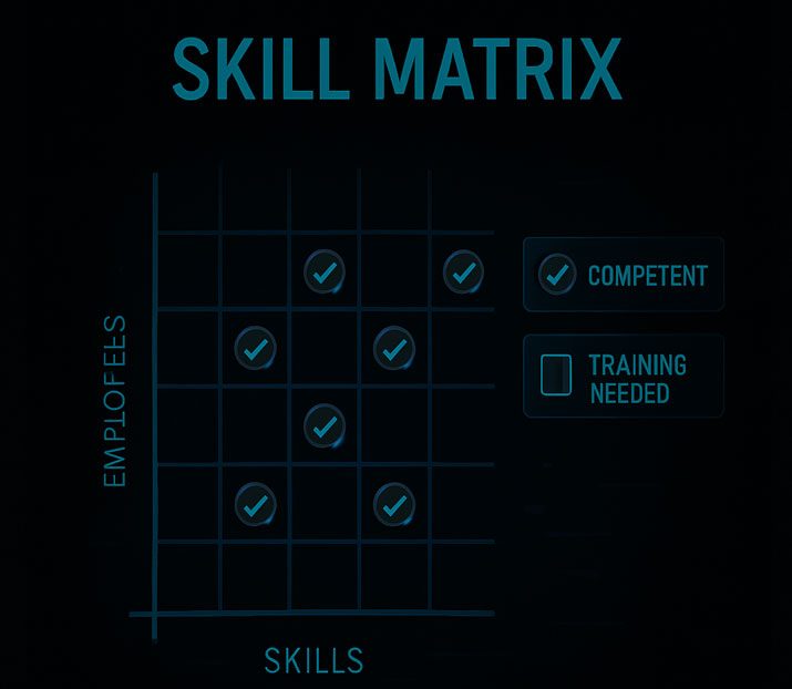 Outil visuel pour évaluer, suivre et développer les compétences des équipes. Permet une meilleure allocation des ressources et la mise en place de plans de formation ciblés.